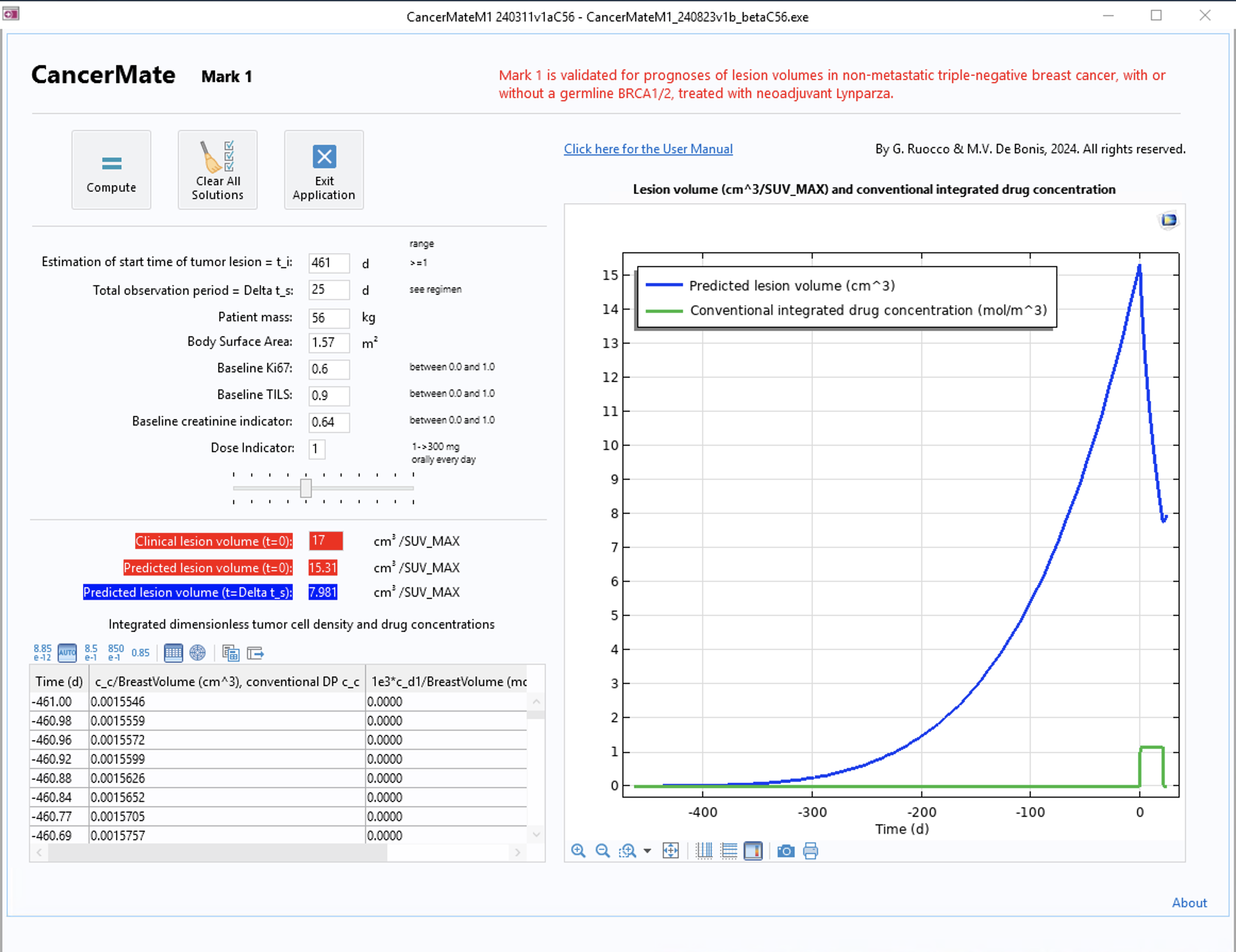 The interface of the app includes the ability to input patient data, display numerical results, and visualize the graphical progress of predicted lesion volume and integrated drug concentration over time (Figure 5). The input fields for the patient-specific biomarkers are the starting points for the oncological predictions, where the first input field is an estimation of the start time of the tumor lesion. The other input fields include the total observation period (which depends on the therapy that will be used), patient mass, body surface area, and the baseline Ki67 and TILs values. Additionally, input fields for the dosage and baseline creatinine indicators are included, which directly relate to the pharmacodynamics (how the drug fights the tumor) and the pharmacokinetics (how the body disposes the drug by bodily functions).